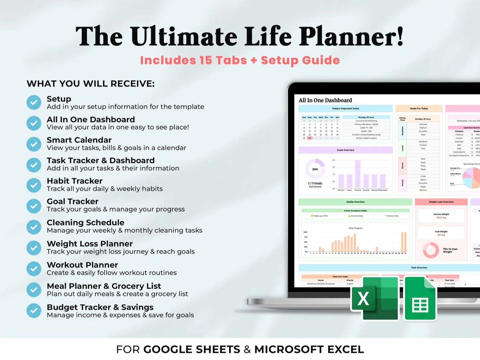 🌱 Ultimate ADHD Life Planner (15 Tabs) - Excel & Google Sheets ・Setup Menu ・All In One Dashboard ・Smart Calendar ・Task Tracker & Dashboard ・Habit Tracker ・Goal Tracker ・Cleaning Schedule ・Weight Loss Tracker ・Workout Planner ・Meal Setup & Planner ・Grocery List ・Budget Tracker ・Savings Tracker