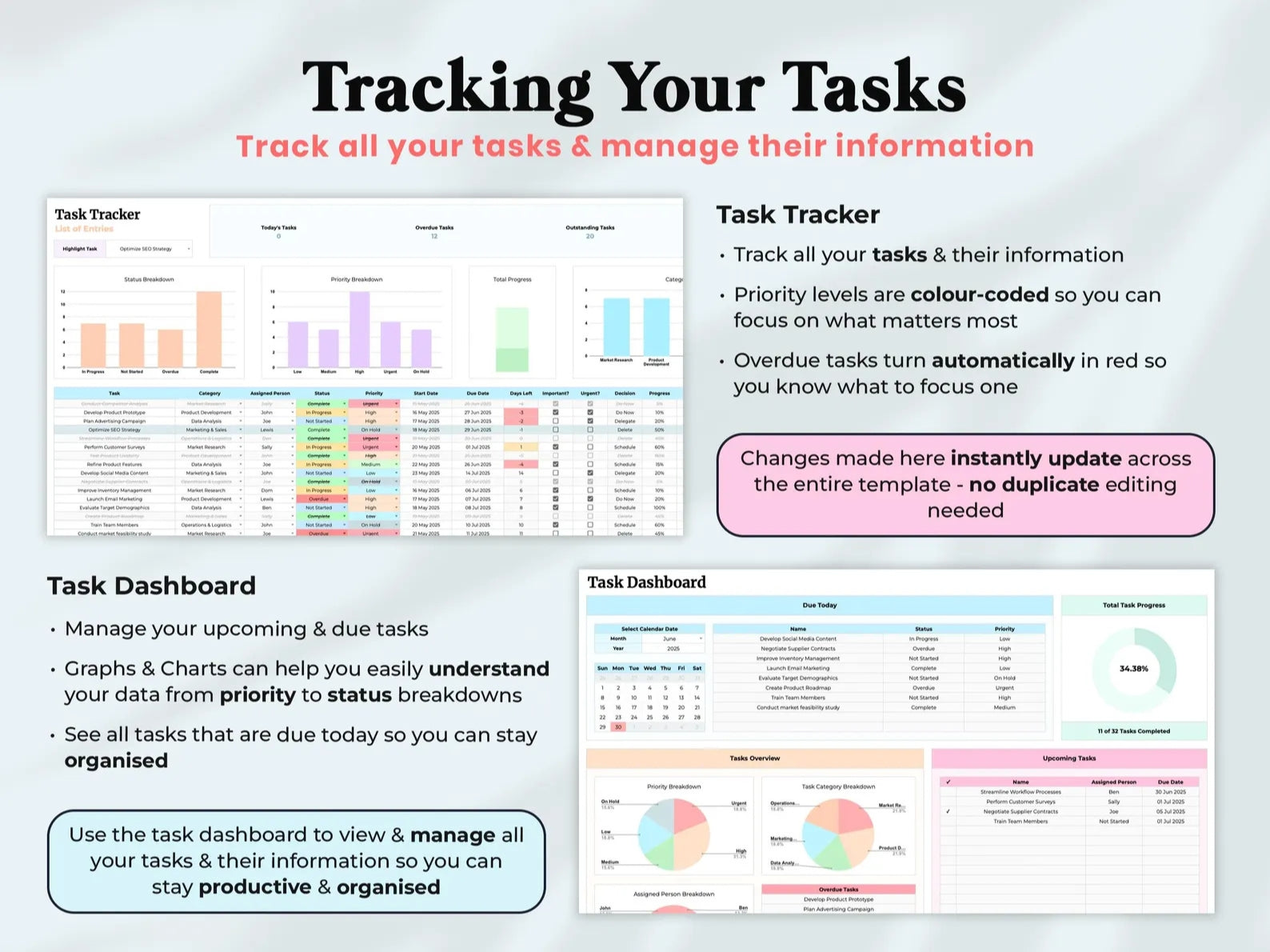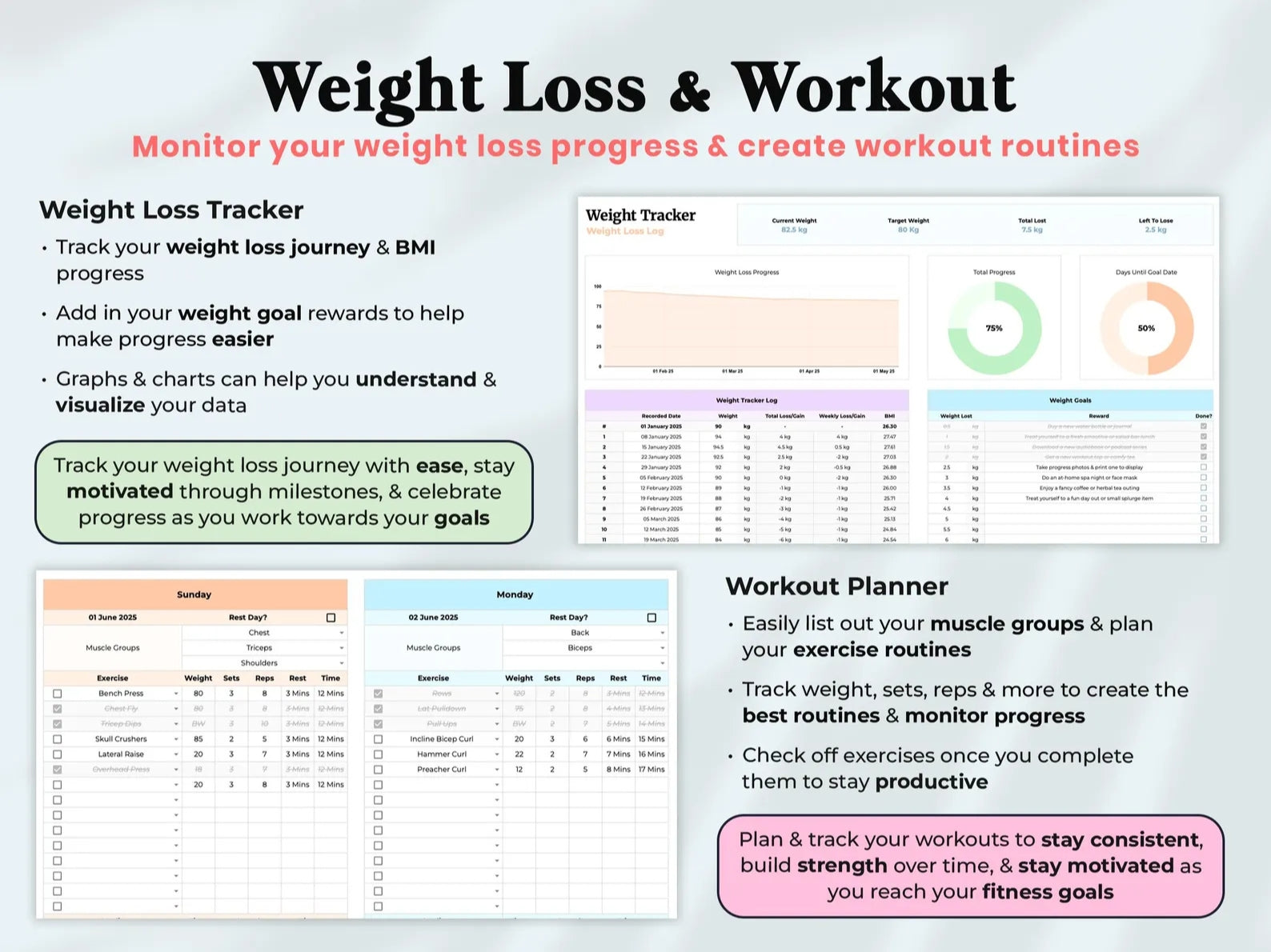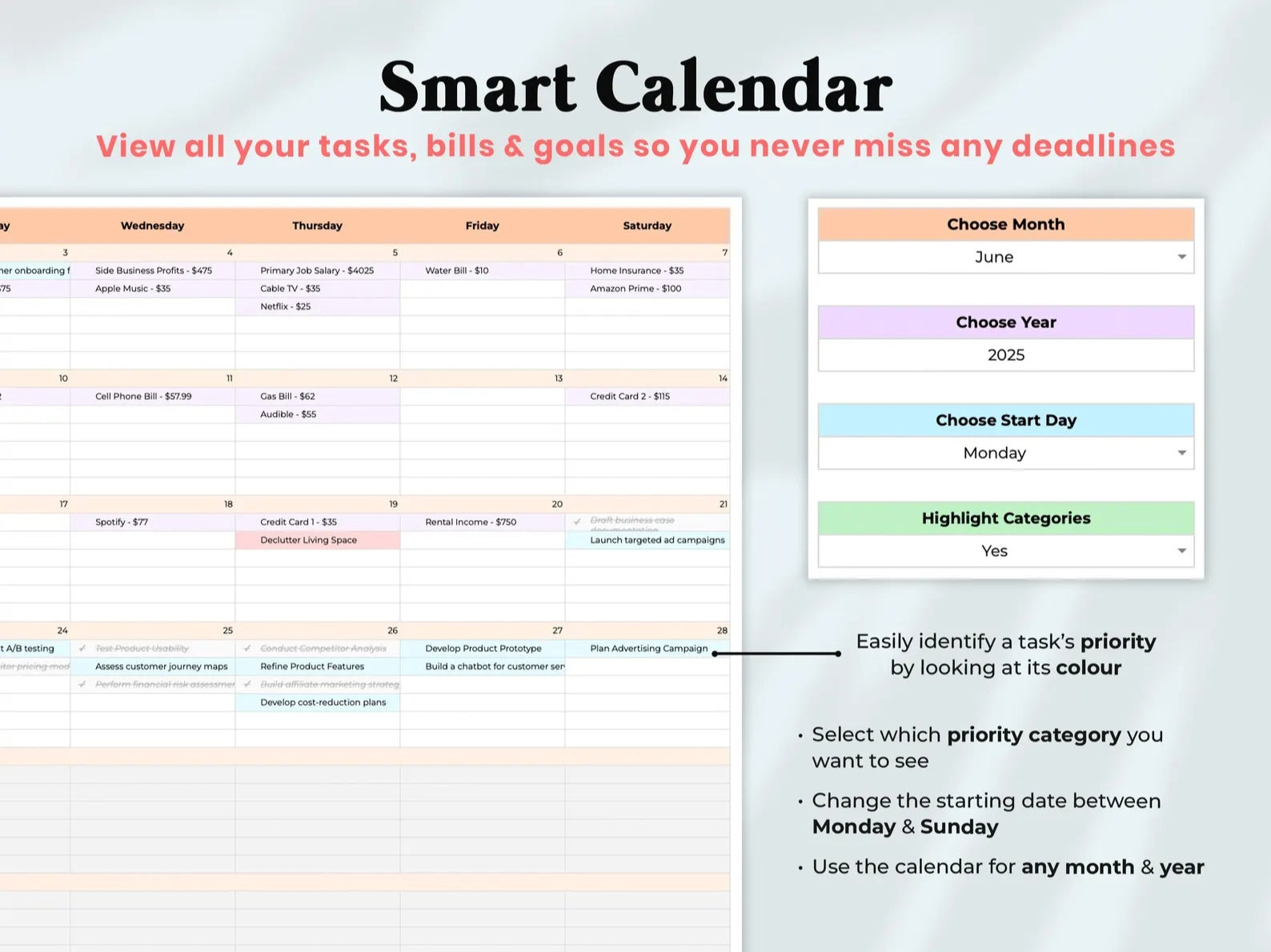 📅 Plan smarter - Smart calendar, habit tracker & task tracking that works for ADHD brains 🍽️ Simplify routines - From meal planning to cleaning, everything’s mapped out & ready to go 💰 Manage your money - Track your budget, spending & savings with clarity 💪 Build consistency - Log habits, workouts, and weight loss progress all in one space 📊 Built for Google Sheets & Excel - easy to use, ADHD-friendly & completely customisable. 💡 One tool. All your life systems. Finally, organised.